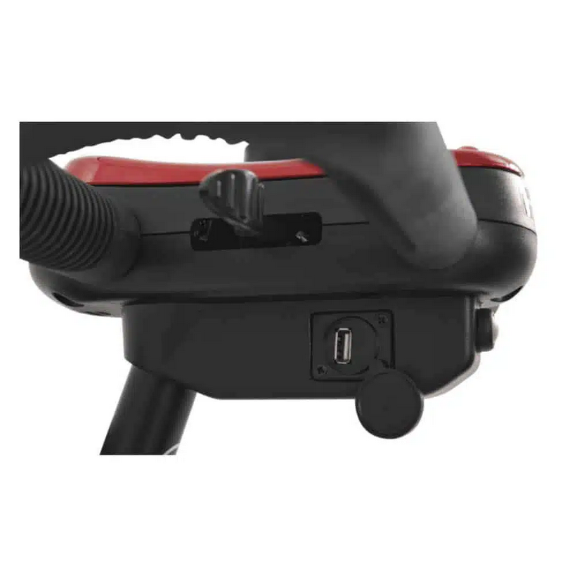 Battery charger port conveniently located under the tiller
